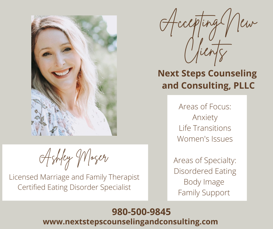 Next Steps Counseling and Consulting, PLLC provides virtual therapy to North Carolina, South Carolina, and Illinois residents. Areas of focus include anxiety and life transitions specializing in body image, disordered eating, and women's issues.