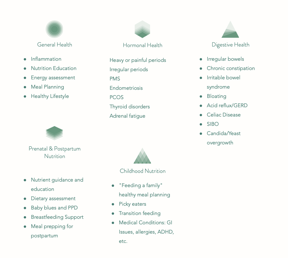 I have a passion for educating and guiding women trying to feel their best, cultivating confidence and a balanced lifestyle, prenatal or postpartum journeys, or navigating the new waters of nourishing children and families. I'm committed to going above and beyond so my clients can create long-term success. Each client will learn about the benefits of real food and how it fuels every part of the body, implement positive health behavior changes and reinforce healthy lifestyle habits to ensure they feel better and are empowered to advocate for their own health for the rest of their life.