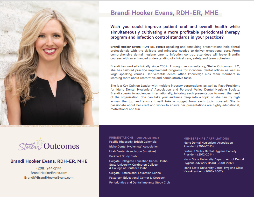 Hey, y’all! Brandi Hooker Evans here. I am an experienced team trainer, motivational speaker, and engaging continuing education provider. I have been a clinical dental hygienist since 2007. Using my master’s degree in health education as well as specialized adult learning tactics to help dentists and their teams achieve their highest potential as professionals are my jam. My training approach is encouraging and efficient, and I like to think my enthusiasm is contagious! My customers are dentists and their teams. With the Stellar Coaching program, they swiftly adopt the skillsets and mindsets needed to achieve healthy patients and practices, all while being healthy providers!