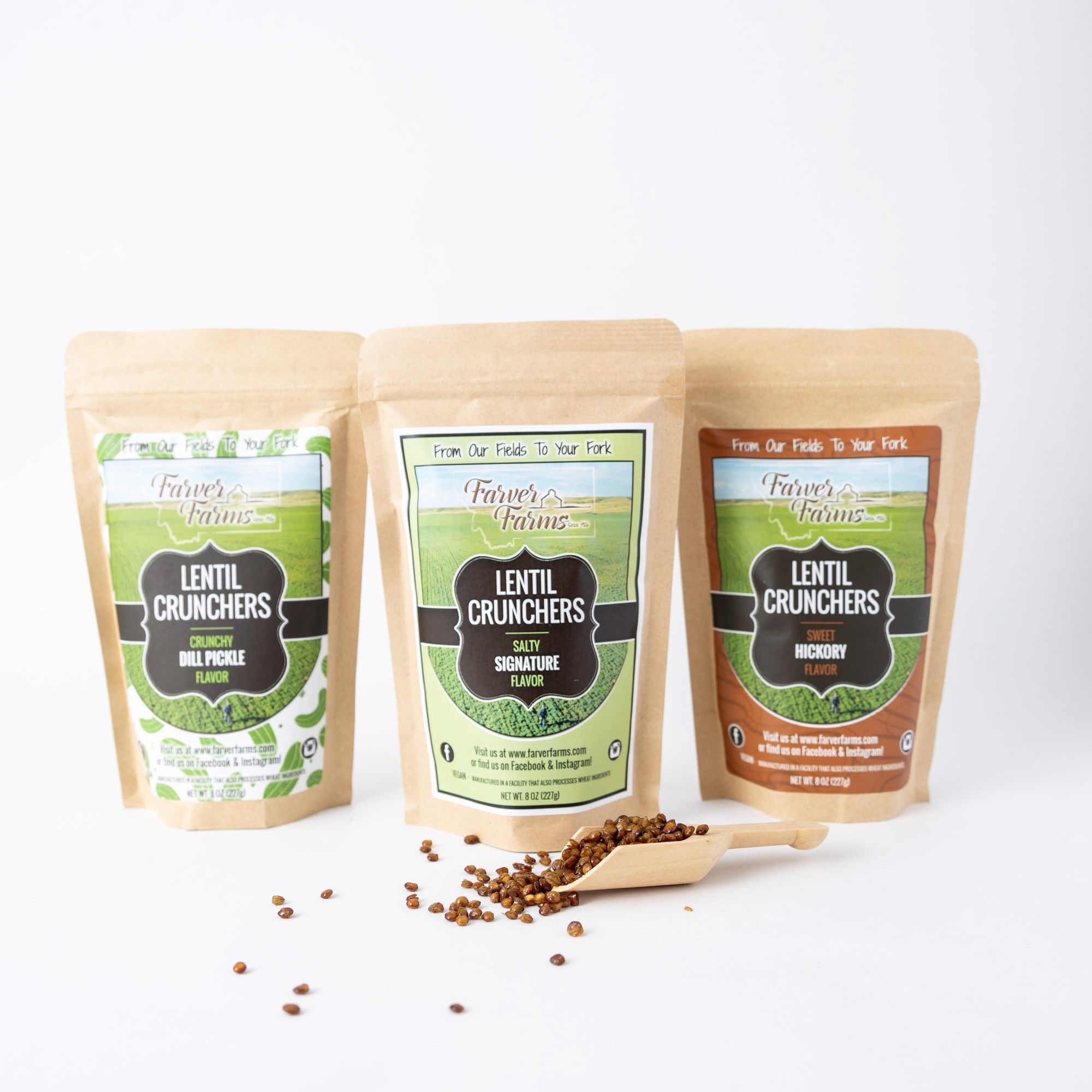 We are Farver Farms, and we produce a ready-to-eat snack made from the lentils we grow in our fields on our 5th-generation family farm. From our fields to our private processing center to be cooked and packaged, then shipped directly to the consumer or to one of our retail partners, we provide a true field-to-fork experience! Our Lentil Crunchers Snacks are vegan or vegetarian, gluten-free, and packed with fiber and protein.