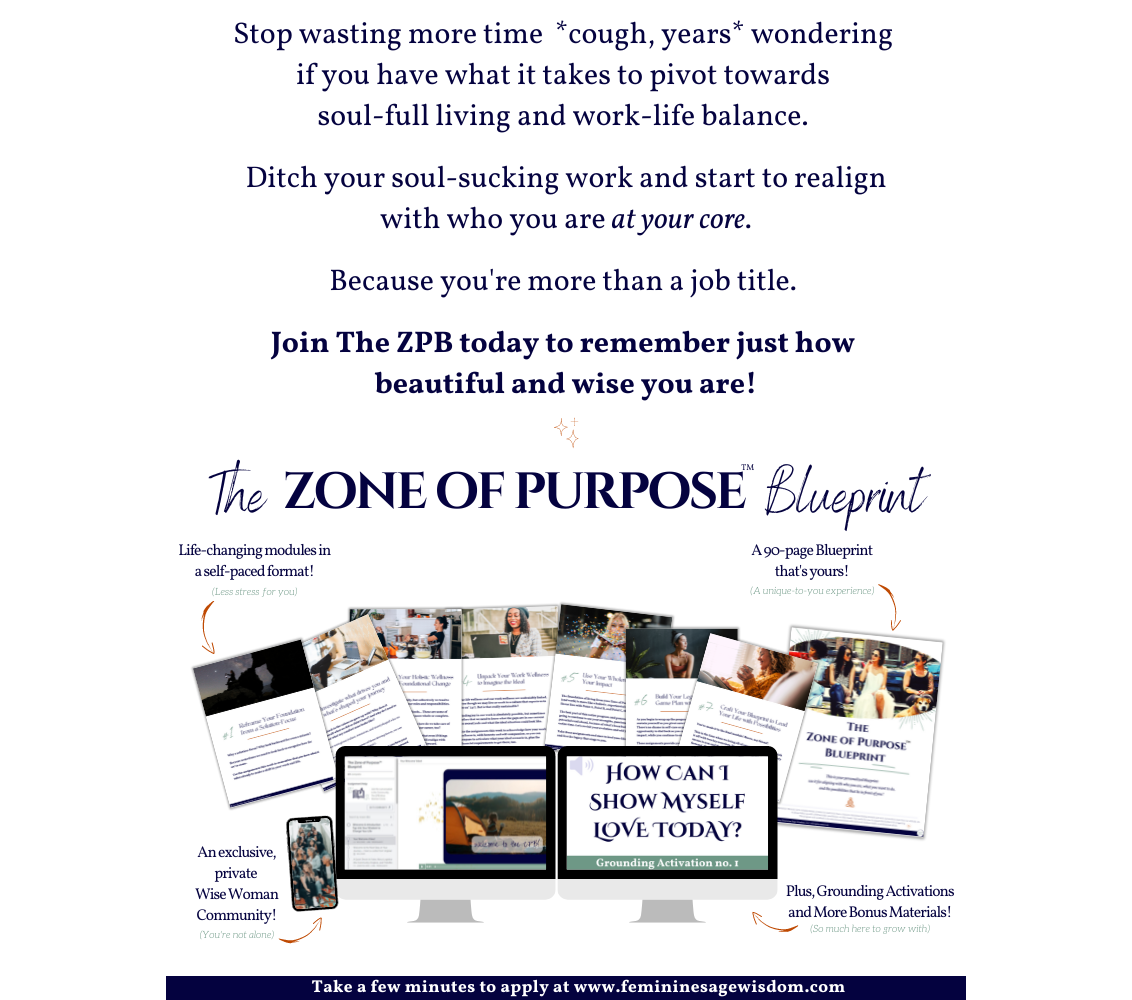 In my signature program, The Zone of Purpose Blueprint, I guide Millennial women who are driven and a little "Type A" (like me) towards their transition in work and life. They already know they're ready to ditch what doesn't align with them any longer, especially soul-sucking work. And they just need clarity, confidence, and, frankly, the friendly nudge to help them do it. I fully believe in soul-full living and help women take a chance on themselves: to walk out of their comfort zone, realign with their wellness, and take the next steps towards their legacy and impact by leading their life on their terms. Leading their life in new ways may look like starting a business, establishing a non-profit, being a consultant, or finding a new job that sings to them. Yet, while they unpack their evolution to "start their career revolution," I offer much more than a career pivot: I offer them a new way of living.