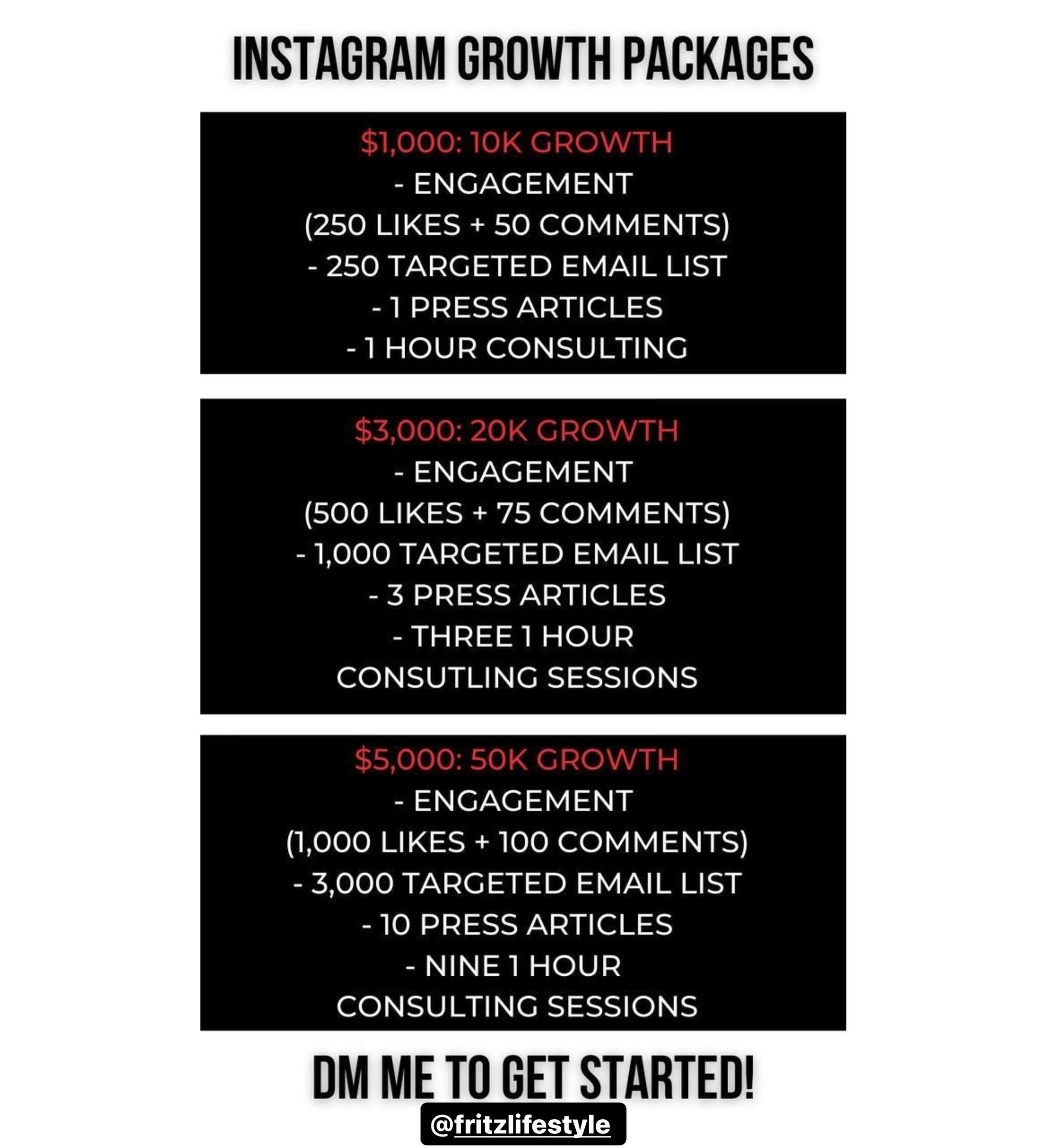 The Instagram followers will come from giveaway campaigns from B-list celebrities and influencers that will host these giveaways to their followers, and the rule is to follow a certain account that is currently following 50-100 people (which are the clients - you) in order to enter the giveaway. The PR (press release) helps you create exposure & brand credibility and will get my clients featured in media outlets that have decent domain authority, so when people google you or your business, your information will show up. The target email list will come from your competitor or another brand that has the audience or potential leads you need. The data is gathered through an excel sheet and can be the ultimate tool for running email campaigns and retargeting ads through Facebook and Instagram.