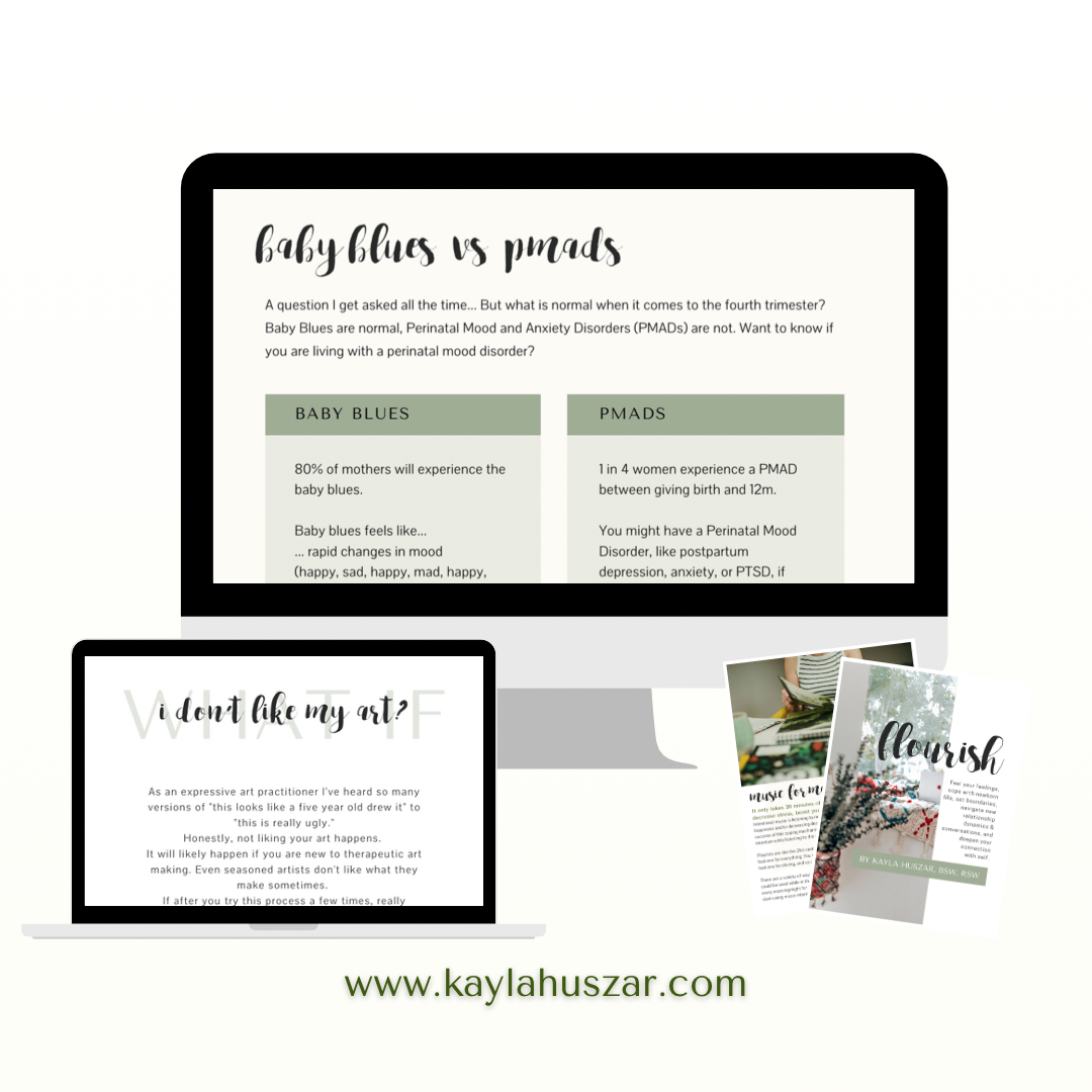 I'm Kayla Huszar, a social worker, an expressive art therapist, and a certified perinatal mental health professional. I support pregnant, postpartum, and parenting moms with expressive art therapy. I'm on a mission to create more opportunities for mothers to take care of themselves, be more mindfully creative, and sit in circles with other women. I want to disrupt the narrative that productivity = worthiness, stop the story that art is only for kids, and create a community that knows they are not alone in the struggle of parenting. I try to create offerings that allow and invite structured time to leave the chaos of life and just be in everything I do.