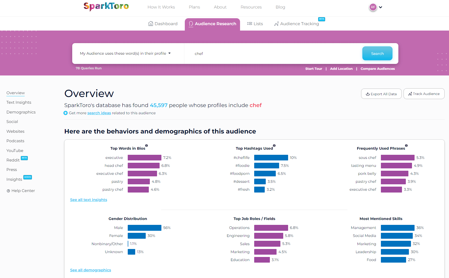 SparkToro makes audience research software. Our customers range widely, but most are marketing professionals and product builders seeking to better understand their potential customers' online behaviors and demographics.